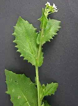 Die Grundblätter sind kurz gestielt und in Rosetten angeordnet. Die Blattspreite der Grundblätter ist breit-oval und grob gezähnt. Die Stängelblätter sind wechselständig und herzförmig stängelumfassend.[2]