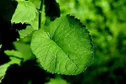 Die gleichmäßig wechselständig am Stängel angeordneten Laubblätter sind in Blattstiel und -spreite gegliedert.[2] Das charakteristischste Merkmal innerhalb der Gattung Jacobaea sind die breiten einfachen, höchstens 1,5-mal so langen wie breiten deutlich herzförmigen bis dreieckigen Blattspreiten.[2] Im Gegensatz zum ähnlichen Berg-Greiskraut (Jacobaea subalpina (W.D.J.Koch) Pelser & Veldkamp) sind die Blattstiele der oberen Laubblätter bei Jacobaea alpina nicht geflügelt, höchstens am Grund mit kleinen Öhrchen. Der Blattrand ist unregelmäßig grob gezähnt.[2] Die Blattoberseite ist dunkelgrün. Die graugrüne Blattunterseite ist oft spinnwebartig wollig behaart und verkahlen später.[1][2] Die Grundblätter sind relativ lang und ungeflügelt gestielt.