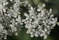 Die Blütezeit reicht von Juni bis August[3]. Die Blüten stehen in doppeldoldigen Blütenständen mit aufwärts gebogenen Strahlen und oft unterschiedlichen, zurückgekrümmten Hüllchenblättern. Die Dolden sind während der Anthese flach.[2] Die Seitendolden stehen am Ende wechselständiger Äste in der Achsel eines Hochblatts.[2]