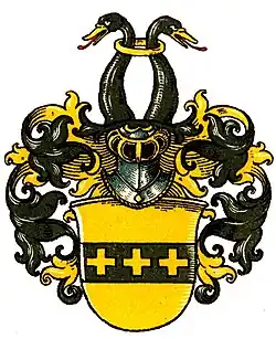 In Gold ein schwarzer Balken mit drei goldenen Kreuzen. Auf dem Helm mit schwarz-goldenen Decken zwei schwarze voneinander abgewandte Schwanenköpfe mit goldenen Schnäbeln, die durch einen goldenen Ring zusammengehalten werden.