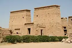 Die Front eines Tempels bildete spätestens seit dem Neuen Reich der so genannte Pylon, ein Architekturelement, das die Funktionen von Türmen, Mauer und Tor in sich vereinte. Im Prinzip war ein Pylon eine zweiteilige Frontmauer mit geböschten Seiten. In der Mitte befand sich ein niedrigeres Tor, das begehbar war und auf dem Rituale stattfinden konnten. Vor dem Pylon standen Flaggenmasten, teilweise Obelisken oder Kolossalstatuen. Pylone bildeten auch die Fronten der nachfolgenden Räume und Höfe, so dass ein großer Tempel durchaus mehrere, nach hinten kleiner werdende Pylone aufwies. Architekturgeschichtlich war es meist so, dass Herrscher Zusatzbauten bei Tempeln vorne ansetzten und dabei größer und höher als die existierenden Tempelteile bauen mussten.