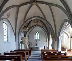 St. Johannes Baptist ist ein zweischiffiger unregelmäßiger Bruchsteinbau in romanisch-gotischen Formen. Der Chor ist zweijochig und schließt gerade, das Langhaus besteht ebenfalls aus zwei Jochen. Der Turm ist dem Schiff vorgebaut, der Innenraum wird von gotischen Kreuzrippengewölben überwölbt, nur im Hauptschiff befindet sich ein Netzgewölbe und im Turmuntergeschoss ein Sterngewölbe.