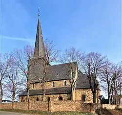 Die Kirche ist aus Bruchsteinmauerwerk, in dem römische Ziegel und Gussbetonblöcke mitverbaut sind, errichtet. Für die Eckquaderung wurden teilweise Kalksinterplatten verwendet. Über dem Westgiebel erhebt sich ein schiefergedeckter Dachreiter mit Spitzhelm aus spätgotischer Zeit.