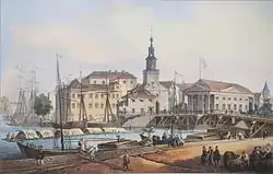 Die alte Börse wurde 1624[3] auf Pfählen über dem Fluss Pregel im Stil venezianischer Gebäude östlich der Grünen Brücke am Kneiphof erbaut. Das Gebäude war mit „Säulen, die durch eine Rundbogenarchitektur miteinander verbunden waren, und mit zwei der Langgasse parallelen Dächern, die auf ihren Giebeln eine Barockarchitektur“ zeigten, versehen.[2] 1624 wurden die Statuen von Merkur und Neptun mit den Wappen des Kneiphofs auf die Fassade gesetzt.