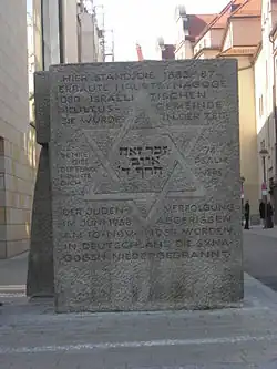 Seit 1969 erinnert ein von Herbert Peters geschaffener Gedenkstein in der Herzog-Max-Straße/Ecke Maxburgstraße an die Synagoge.[7]