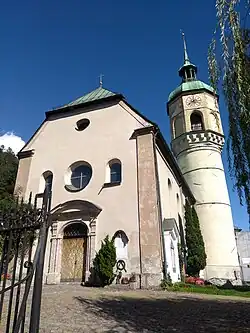 Der spätgotische einschiffige Bau besteht aus einem vierachsigen Langhaus und einem dreiseitig schließenden Chor im Osten. Die Fassaden sind sparsam gegliedert. Die westliche Eingangsfassade weist Eckpilaster mit schlichten Kapitellen und das Hauptportal in Nagelfluh auf. An der Südseite vor dem östlichsten Langhausjoch befindet sich ein weiteres kleines, spätgotisches Portal. Dem südlichen Übergang vom Langhaus zum Chor ist der markante Rundturm mit achteckigem Glockengeschoß vorgesetzt, der von einer Welschen Haube mit Laterne abgeschlossen wird. An der Südseite des Chors ist die zweigeschoßige Sakristei angebaut.