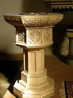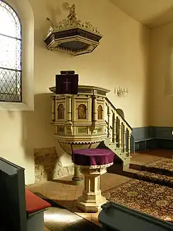 - ↑ Informationstafel an der Rückseite des Kanzelkorbs: „Dieses Feld enthielt ursprü[n]glich wie unten angegeben ein Bild von Moses, das durch Ofenhitze zerstört worden ist. Es wurde bei der Gesamtrenovierung der Kirche im Jahre 1925 (15. April – 8. Juli) mit dem Bilde Matthäus’ ausgetauscht.“