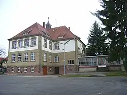 Das Haus erstreckt sich über zwei Etagen und ein Dachgeschoss mit einem Glockenturm. Es ist umgeben von einer zugehörigen Wiese und dem ehemaligen Pausenhof. Im Erdgeschoss des Gebäudes befanden sich zunächst drei Klassenräume für die Elementarschule und ein Lehrerzimmer. Zudem wurde es beim Bau mit einer Zentralheizung ausgestattet. Im ersten Stock existierten ein Saal für die Fortbildungsschule und eine Lehrerwohnung ohne Bad mit vier Zimmern, Küche und Diele.