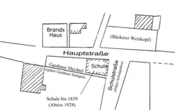 Das erste bis 1839 genutzte Schulhaus befand sich an der Ecke Schulgraben/Hauptstraße. Dieses Eckhaus Hauptstraße Nr. 48 war 1928 in Besitz des Gastwirts Stephan Mechtel. Beim Abriss des Hauses aus verkehrsbedingten Gründen im Jahre 1928 überließ Stephan Mechtel Teile des schönen und reich verzierten Fachwerks Herrn Pastor Koster.[1] Diese Teile zieren heute wieder den Hausflur des Erdgeschosses im Lösnicher Pfarrhauses. Das auf Kopfbändern ausladende Fachwerkobergeschoss hatte vier Fensterpaare und eine Gruppe von drei Fenstern in wenig vortretenden Rahmen mit Zahnschnittgesimsen und Kerbschnitzereien (Flechtwerk und Scheibenfriesen).[2] Beim Abbruch kam laut Pastor Koster auch ein Türsturz mit der Jahreszahl 1432 zum Vorschein, der mit gotischen Minuskeln versehen war.[1] Stephan Mechtel soll beabsichtigt haben, dieses alte geschichtliche Dokument in der Unterbau der an jener Stelle geplanten Veranda einmauern zu lassen.[3] Der Stein ist mittlerweile jedoch verschollen.