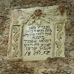 An der Eingangsseite der Synagoge befand sich unterhalb der Dachtraufe folgende Inschrift: „Gebaut von Gemeindevorsteher Mosche Bierig und seiner Frau Keile. ‚Es werden deine Scheunen voll und deine Kelter von Wein überlaufen‘ 1852“.