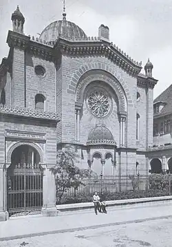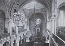 Der Bau wurde im Stil des Historismus mit neoislamischen Elementen gestaltet. Die Ostfassade an der Hospitalstraße war von maurischen Zinnen gekrönt. Im Mittelteil der Ostfassade war eine Apsis, in der sich der Toraschrein befand. Über der Apsis erhob sich ein Rundbogen, der mit maurischen Pflanzenornamenten verziert war. Die Innenarchitektur war nach dem Vorbild der Alhambra im maurischen Granada gestaltet worden.