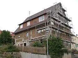 Es handelt sich um ein giebelständiges zweistöckiges Haus mit Satteldach, das in Geschossbauweise errichtet wurde. Es steht am Hang und besitzt auf der Straßenseite zwei Gewölbekeller, wobei der östliche Keller mit firstparallelem Tonnengewölbe aus der Erbauungszeit stammt und von der Straße aus ebenerdig betreten werden kann.[1] Von hier aus erfolgte der Zugang in den westlichen Gewölbekeller.