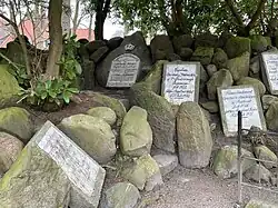 | Friedrich Wilhelm Funke | 1785–1862[5] | Kaufmann und Bürgermeister | Zwei gusseiserne Kreuze, Felsen und klassizistischer Pfeilergrag. Größeres Kreuz verziert mit dem Haupt Christi mit dem Dornenkranz. | Christian Friedrich Tieck (Haupt Christi) | |