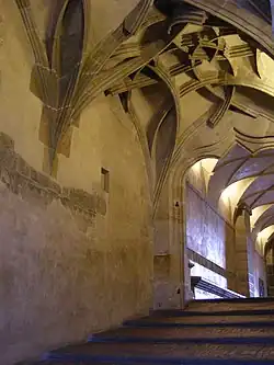 Diese Reitertreppe gehört zu den ältesten bekannten Reitertreppen und ist auch eine der ältesten Treppen in Prag. Sie entstand um 1500 während des jagiellonischen Palastumbaus durch den Baumeister Benedikt Ried. Sie ist 3,5 m breit, 8,4 m lang und hat neun lange, niedrige und leicht nach vorn geneigte Stufen, die für Pferde angenehm zu gehen sind. Die Reitertreppe ist mit einem aufwendigen spätgotischen Kreuzrippengewölbe ausgestattet.[7][2][11]