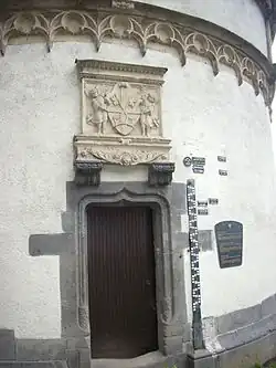 Die stadtseitige Tür weist eine Kielbogenrahmung aus Basaltlava mit Eselsrückenstab zwischen Hohlkehlen auf, der Sockel des Stabes mit wechselnd schräg gelegten Hohlkehlen und Perlstäben. Das landseitige Originaltuffrelief gleicher Ausführung vom selben Künstler ging um 1800[5] verloren und wurde 1894, 340 Jahre nach Baubeginn und circa 100 Jahre nach Verlust des landseitigen Wappensteins durch ein neues Relief ersetzt, das das Wappen von zwei kleinen Engelsfiguren gehalten zeigt und die Jahreszahlen „1554“ und „1894“ trägt.