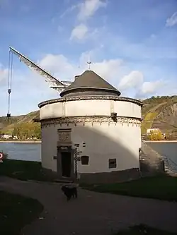 Auf das Fundament wurde mithilfe eines Spill genannten galgenförmigen Baukrans das steinerne, 6,8 Meter hohe Kranhaus mit ein Meter dicken Mauern aufgebaut, das einen Außendurchmesser von 10,70 Meter (innen 8,70 Meter) hat und auf einem unten vorkragenden Sockelring aus vier Lagen Basaltsteinen ruht. In circa 5 Meter Höhe ziert ein umlaufender Dreipassbogenfries aus Tuff das Krangebäude, durchbrochen von vier Wasserspeiern aus Basalt, zwei Krokodilköpfen, landeinwärts blickend, zwei Löwenhäuptern, flusswärts schauend. Das Kranhaus weist als Besonderheit oberhalb des Frieses einen weiteren, den Dachrand und den unteren Teil des schiefergedeckten Kegeldaches überragenden, leicht vorkragender Mauerring auf, der Kranzgesims oder Brüstung von ca. 1,5 Meter Höhe trägt. Dadurch hat das Kegeldach keinen natürlichen Ablauf, sondern ist ähnlich einer Turmplattform vom Mauerwerk umgeben. Das Gesims ist mit einem ebenfalls vorkragenden, ca. 0,3 Meter hohen Blattwerkfries aus Tuffstein abgeschlossen und von acht Tuffpilastern (vier jeweils über den Wasserspeiern) geziert, mit einem Kopf im Profil in der Mitte, von kreisförmigem Rand umgeben.