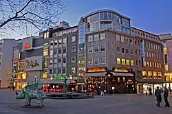 Im Zweiten Weltkrieg wurde die historische Innenstadt nahezu vollständig zerstört. Im Zuge der Neuordnung der Innenstadt beim Wiederaufbau wurde der Marktplatz mehrere Meter nach Süden verschoben und die Platzkanten begradigt. Dabei kam es zu einzelnen Abrissen noch erhaltener Gebäude. An Stelle der alten Architektur wurde moderne Zweckarchitektur errichtet. Die westliche Flanke nimmt vollständig das ehemalige Althoff-Kaufhaus, heute Karstadt, ein. In der Mitte des Marktes entstand eine Kioskanlage mit unterirdischer Bedürfnisanstalt.