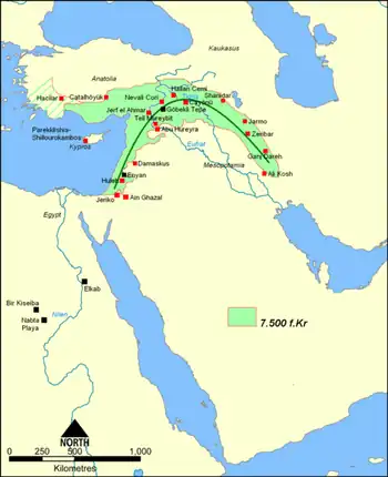 Aus dem auf das Epipaläolithikum folgenden Präkeramischen Neolithikum A (9500–8300 v. Chr.[6]) sind weniger Fundorte bekannt als aus dem Natufien. In den wenigen wurden aber einige grundlegende Neuerungen in der Siedlungsweise fassbar. So wurden zum Bau der runden Gebäude sonnengetrocknete Lehmziegel verwendet, wie etwa beim Turm von Jericho. Siedlungen verfügten nun auch über Gemeinschaftsbauten, wie etwa in Jerf el Ahmar. Der spektakulärste Fundort des Präkeramischen Neolithikums A ist Göbekli Tepe, eine monumentale Kultanlage, die wahrscheinlich von einer nicht-sesshaften Bevölkerung errichtet wurde und deren Anfänge bis in das frühe 10. Jahrtausend v. Chr. zurückreichen.