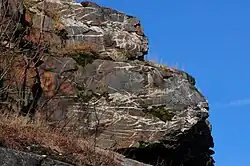 Das überwiegend dunkelgraue und massige Gestein des Felsens ist in unterschiedlicher Dichte von milchig-weißen Trümern und fetzenartigen Zerrungsstrukturen des Quarzes durchzogen. Freiliegende Kluftflächen erzeugen mit ihren dünnen Mineralbelägen auf der Felsoberfläche eine braune Färbung. Der Felsen befindet sich in einem Riffzug des Hohen-Stein-Quarzits innerhalb der kambroordovizischen (nach anderer Auffassung nur Tremadocium[2]) Schöneck-Formation. Ungeachtet leichter tektonischer Beanspruchungen, wie an kleinen Deformationen der Quarzlagen sichtbar, ist der Ursprung aus einer fein- bis grobsandigen Grauwacke durch die Kornstruktur noch erkennbar. Typlokalität für diese Fazies ist der Hohe Stein unweit von Erlbach an der tschechisch-deutschen Grenze.[3] Auffälliges topographisches Merkmal für dieses schwer zerstörbare Gestein sind zackige Felsformationen.[1] Nach aktuellem Stand wird das Ausgangsgestein als Teil einer siliziklastischen Sedimentserie der Schelfzone im Absenkungsbereich eines Riftbeckens interpretiert, deren Mächtigkeit bis 3000 m erreichte.[4]