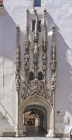 Am Eingangsportal des Rathauses fällt zunächst das schiefe mittlere Türmchen ins Auge. Der Sage nach war der Erbauer des Portals Anton Pilgram mit der Bezahlung nicht einverstanden, und nachdem man seiner Forderung nach einer Aufbesserung nicht nachkam, erbaute er das Türmchen schief.