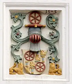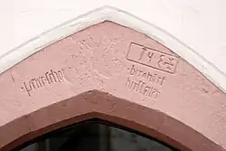 In dem Türsturz über dem spitzbogigen Portal erkennt man noch heute die im Sandstein eingemeißelte Zahl 1434 als Jahr der Erbauung und den Namen des kurmainzischen Baumeisters Bernhart (in der Literatur: Lienhart) Hirtseller.[2] Weiter links oben ist das Wappen von Erzbischof Berthold von Henneberg in das Mauerwerk eingelassen.[2]