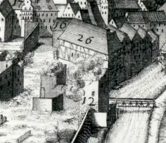 Das dreigeschossige Bauwerk befindet sich auf einem Grundstück am Kocher, auf dem einst eine mittelalterliche Synagoge stand. Urkundliche Erwähnung fand diese „Judenschule“ im einstigen jüdischen Ghetto von Schwäbisch Hall in den Jahren 1356 und 1457; 1457 war sie allerdings bereits in christlichen Besitz übergegangen. Im Kellergeschoss des heutigen Bauwerks, dessen Sohle zum Kocher hin stark abfällt, ist noch Mauerwerk aus der Zeit um 1200 zu finden, weitere Überreste von Vorgängerbauten sind in Gestalt von mittelalterlichem Mauerwerk im Keller erhalten geblieben; das eigentliche Gebäude stammt aber aus späteren Zeiten.[1]