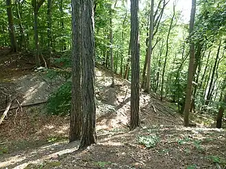![]() Eine von mehreren Wall- und Grabenanlagen auf dem Bergsporn | ||