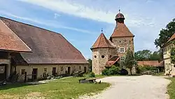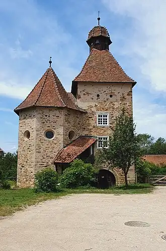 Davon sind heute nur noch der Torturm mit angebauter Kapelle erhalten. An den vierstöckigen Torturm mit Pyramidendach und barocker Dachhaube als Spitzenabschluss lehnt sich die polygonale Kapelle mit zu drei Seiten angedeutetem oktogonalem Kegeldach an, die durch Rundfenster gekennzeichnet ist. Hofseitig führt außen eine überdachte Treppe von der Kapelle zum ersten Stock im Torturm. Das Denkmalensemble, wie auch das angrenzende ehemalige Meiereihaus und die anderen Gebäude des Hofes, kann nur von außen besichtigt werden.