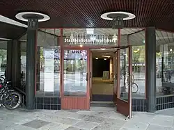 Das Kulturhaus grenzte mit der Kinderbibliothek an der Südostseite anfangs noch an die Grünflächen des Klieversbergs. In den 1960er Jahren wurden im Dachgarten Tanztees mit Blasmusik abgehalten.[4] Teil des Hauses war eine lineare Ladenzeile an der damals noch befahrenen Porschestraße, in der kleinteiliger Einzelhandel ansässig war, darunter ein Blumengeschäft und ein Reisebüro.[5] Später wurden in den ehemaligen Ladengeschäften Ausstellungsflächen für die Bibliothek und Räume für sonstige kulturelle Aktivitäten eingerichtet.