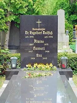 Der Aufenthalt der Familie Dollfuß in Kanada wurde in Österreich erst nach dem Krieg bekannt.[26] 1950 besuchte Alwine das Land privat,[27] ab 1951,[24] nach anderen Angaben 1955[28] oder 1957, lebte sie wieder dauerhaft in Österreich. Dort erhielt sie ihre Pension rückwirkend bis in das Jahr 1945 ausbezahlt, und zwar immer noch nach der großzügigen Sonderregelung von 1934. Erst 1961 wurde das entsprechende Gesetz abgeschafft und ihre Pension auf das übliche Maß reduziert. Nach der Rückkehr ihrer Tochter Eva lebte sie mit ihr zusammen zurückgezogen in Wien, wo Alwine Dollfuß 1973 verstarb.[20] Das Grab der Familie befindet sich am Hietzinger Friedhof, wohin die Nationalsozialisten den Leichnam Engelbert Dollfuß’ aus „seiner“ Gedächtniskirche zurück überführt hatten.