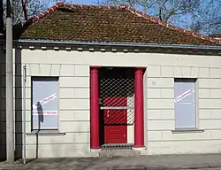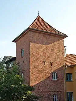 - Nr. 6b: 1-gesch. ehem. Torhaus (D) mit Walmdach und rubinrotem Säulenportal