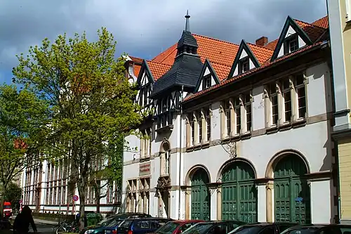 Das Hauptgebäude,[2] ein zweigeschossiger Putzbau, dessen Dachausbauten in Fachwerk-Bauweise gestaltet und mit renaissancistischen Stilelementen verziert wurden,[1] wurde im Erdgeschoss mit einem großen Remisenraum als Unterstand für den automobilen Löschzug gestaltet.[2]