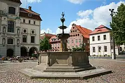 Brunnen | Der Brunnen befindet sich etwas westlich des Mittelpunktes des Marktes. Es ist eine Kopie, das Original befindet sich im Museum für das Fürstentum Lüneburg. Erschaffen wurde der Brunnen um 1540. Über zwei Schalen befindet sich eine Säule und darüber eine Statue der Göttin Artemis. Der bekrönende Halbmond wurde 1970 gestohlen, von Harald Haacke später nachgebildet. | 30666076 |