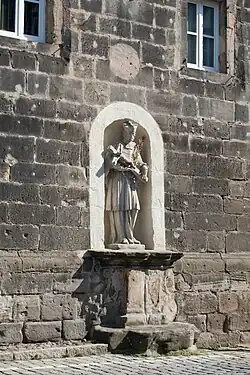 Am Fuß der zur Schwedenstraße weisenden Westfassade des Gebäudes steht auf einem Sockel eine Statue des Heiligen Johannes Nepomuk. Über der Statue befindet sich eine der ehemaligen Schießscharten, die beim Umbau des Gebäudes im 19. Jahrhundert zugemauert und bei den Renovierungsarbeiten 2011 wieder freigelegt wurde. Oberhalb der Schießscharte ist das Wappen des 1725 amtierenden Fürstbischofs des Bistums Bamberg, Lothar Franz von Schönborn, in die Wand eingelassen.