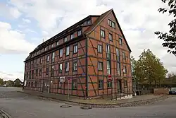 Der dreigeschossige 10-achsige Getreidespeicher ist ein Fachwerkbau mit Backsteinen in der Ausfachung. Markant ist der fünfgeschossige, mittige, südliche Giebelrisalit, der früher als Außenkran diente. Der Speicher stammt aus dem 19. Jahrhundert. Er wurde 1994 im Rahmen der Städtebauförderung gesichert.[2]