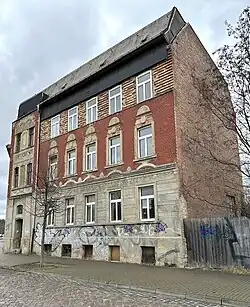 Das dreigeschossige Haus entstand Anfang des 20. Jahrhunderts, nachdem – mit dem 1899/1901 erfolgten Bau der Annenbrücke über die Saale – in diesem Bereich ein neues Baugebiet entstanden war. Die siebenachsige Fassade des repräsentativen Jugendstil-Gebäudes verfügt an ihrer linken Seite über einen flachen zweiachsigen Seitenrisalit. In seinem Erdgeschoss befindet sich der Hauseingang, bekrönt ist der Risalit mit einem eigenen Giebel. Als Verzierungen finden sich an der Fassade Putzdekorationen in floralen Formen.