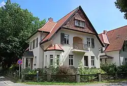 Das Wohnhaus entstand in den Jahren 1909/10 nach einem Entwurf des Maurermeisters H. Baranke. Bedeckt ist das im Stil der Heimatbewegung errichtete Gebäude mit einem steilen Satteldach. Markant ist der für den Heimatstil typische Giebel.