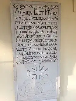 ALLHIER LIGT PEGRABEN DIE DUGENTSAME FRAU ANGELA REGANDIN / STEINMETZMEISTERIN UND GEWESTE RICHTERIN PIS 33 JAHR ALLHIER / HAT AUF DIESER SCHNETEN WELT GELEPT 75 JAHR / IST GESTORBEN DEN 13. JANUARY IM JAHR 1699 / GOTT VERLEIHE IHR UND ALLEN CHRISTGLAUBIGEN SEELEN EINE FRELIGE AUFERSTEHUNG. AMEN.