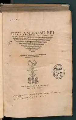 - DIVI AM-||BROSII EPISCOPI MEDIO-||LANENSIS COMMENTARII IN || omnes Diui Pauli epistolas, ex restitutio||ne D.Erasmi diligenter recogniti.|| CVM INDICE.|| Köln: Johann Gymnich I., 1530. Digitalisierte Ausgabe der Universitäts- und Landesbibliothek Düsseldorf