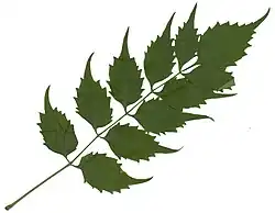 Die gegenständig angeordneten Laubblätter sind in Blattstiel und -spreite gegliedert. Die bis zu 25 Zentimeter langen Laubblätter sind anfangs hellgrün, später kräftig mittelgrün. Sie sind unpaarig gefiedert und bestehen meist aus bis zu 13 eiförmigen bis elliptischen, am Grund etwas asymmetrischen, zugespitzten, kurz gestielten Teilblättchen mit grob gesägten Rändern und spitzer bis keilförmiger oder herablaufender Basis. Die Blättchen sind oberseits kahl und unterseits heller und auf den Adern behaart. Der Blattstiel und die Rhachis sind rinnig.