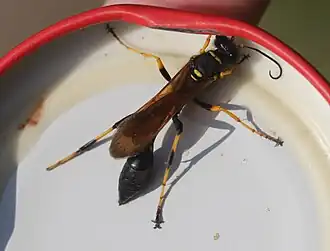 Amerikanische Mauerwespe (Sceliphron caementarium) ♀ im Juni im Rhein-Neckar-Kreis | ||||||||||||