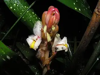 Die zwittrigen Blüten sind zygomorph und dreizählig mit doppelten, rosaroten bis weißen Perianth. Die drei hell rosaroten bis hellbraunen und an der Basis rot gepunkteten, membranartigen Kelchblätter sind auf einer Länge von 1 bis 1,2 Zentimetern röhrenförmig miteinander verwachsen und sind mit einer Länge von 1,5 bis 1,7 Zentimeter sowie einer Breite von etwa 0,4 Zentimeter etwa gleich lang wie die Kronröhre. Sie sind dreifach gezähnt, wobei die Kelchzähne 0,2 bis 0,3 Zentimeter lang sind und haben eine mit Ausnahme der filzig behaarten Basis unbehaarte Außenseite sowie eine spitz zulaufende Spitze. Die drei hell rosaroten bis weißen und 3 bis 3,2 Zentimeter langen, membranartigen und kahlen Kronblätter sind zu einer 1,5 bis 1,6 Zentimeter langen, ledrigen und außen gerillten sowie flaumig behaarten Kronröhre mit filzig behaarter Basis verwachsen. Es sind drei ebenfalls hell rosarote bis weiße und unbehaarte, membranartige und verkehrt-lanzettlich Kronlappen vorhanden. Der mittlere Kronlappen ist etwa 1,5 Zentimetern lang und 0,8 bis 1 Zentimeter breit mit kappenförmigen oberen Ende. Die beiden seitlichen Kronlappen sind bei einer Länge von 1,5 bis 1,6 Zentimetern sowie einer Breite von 0,5 bis 0,7 Zentimetern etwas schmäler und haben ebenfalls ein kappenförmiges oberes Ende. Nur das mittlere der Staubblätter des inneren Kreises ist fertil. Das fertile Staubblatt besitzt einen abgeflachten, 0,3 bis 0,4 Zentimeter langen, kahlen, weißen Staubfaden. Die zwei weißen Hälften des unbehaarten Staubbeutels sind bei einer Länge von 0,7 bis 0,8 Zentimetern und einer Breite von rund 0,5 Zentimetern länglich. Die drei Staminodien des inneren Kreises sind zu einem Labellum verwachsen. Das 1,5 bis 1,7 Zentimeter lange und rund 1 Zentimeter breite, membranartige und dreieckig-eiförmige Labellum ist weiß bis weißlich-rosarot mit einem gelben oder violetten Streifen in der Mitte, welcher von roten Punkten begrenzt wird; es ist an seiner Basis mit zwei Reihen an langen Haaren besetzt und besitzt eine ausgerandete, 0,5 bis 0,6 Zentimeter lange Spitze. Die seitlichen, weißen Staminodien sind bei einer Länge von rund 0,2 Zentimetern länglich. Drei Fruchtblätter sind zu einem dreikammerigen, zottig mit weißen oder gelben Haaren besetzten, bei einem Durchmesser von rund 0,4 Zentimetern kugelförmigen Fruchtknoten verwachsen. Jede Fruchtknotenkammer enthält etwa 30 Samenanlagen. Der Griffel ist unbehaart und endet in einer ledrigen, abgerundeten und unbehaarten Narbe mit bewimperter Spitze.[1][2]
