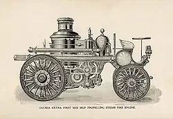 Angeboten wurden Feuerlöschgeräte, häufig durch Dampfmaschinen angetrieben. Sie wurden auf Fahrzeugen montiert, die häufig von Pferden gezogen wurden. Zwischen 1867 und 1906 entstanden auch 22 Fahrzeuge, die einen Dampfmotor als Antrieb hatten. Es waren Zweizylindermotoren. Die Zylinder hatten 9,5 Einheit Bohrung und 8 Zoll Hub. Umgerechnet sind das 241,3 mm und 203,2 mm. Anfangs erfolgte der Antrieb über eine Kette, später über zwei Ketten zur Hinterachse.[2]