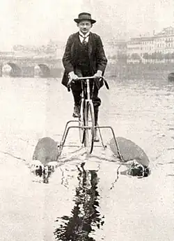 1891 patentierte der Münchner Georg Pinkert sein wassergängiges Dreirad mit großen hohlen Reifen.[9] Bei diesem Modell erfolgte der Antrieb im Wasser durch abstehende Lamellen an den Hinterrädern und an Land mittels festen Gummireifen. Pinkert unternahm 1894 den Versuch mit seinem Gefährt den Ärmelkanal zu überqueren und schaffte die Hälfte.[10]