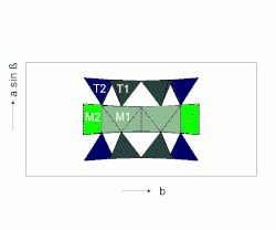 Die C-Position aus der oben angegebenen Strukturformel umfasst die drei strukturell unterscheidbaren Positionen M1, M2 und M3. Auf diesen drei Positionen werden die kleineren Kationen (vorwiegend Mg2+, Fe2+, Mn2+, Al3+) von sechs Sauerstoffen oktaedrisch koordiniert.