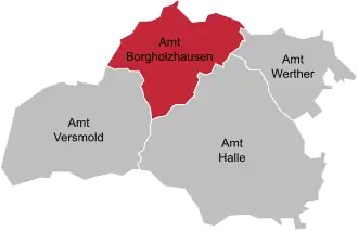 Bei der Einführung der westfälischen Landgemeinde-Ordnung von 1841 wurden die Verwaltungsbezirke unterhalb der Kreisebene, sofern es sich nicht um Städte gemäß der revidierten Städteordnung handelte, zu Ämtern. Im Kreis Halle wurde dadurch aus dem Verwaltungsbezirk Borgholzhausen das Amt Borgholzhausen.[6] Die westfälischen Ämter bildeten die zweitunterste Verwaltungsinstanz und wurden zunächst von durch die Regierung ernannten Amtmännern, später von Amtsbürgermeistern geführt. Nach dem Zweiten Weltkrieg hießen die Leiter der Ämter Amtsdirektoren.