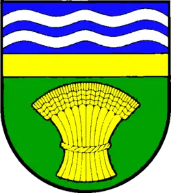 Blasonierung: „Unter blauem, unten mit einem goldenen Balken abschließendem Schildhaupt, darin zwei silberne Wellen, in Grün eine aus elf Ähren bestehende goldene Garbe.“[1]