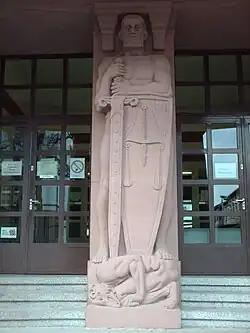 Sitz des Amtsgerichts Gießen ist seit dem 6. Februar 1922 ein 1913–1916 im Auftrag des Großherzoglichen Hochbauamtes erbautes Gebäude in der Gutfleischstraße 1. Besonders auffällig ist der Haupteingangsbereich, der wegen der vier Säulen und der Freitreppe sowie einer Ritterfigur recht imposant wirkt. Im Zweiten Weltkrieg trug das Gebäude große Schäden davon, so wurde etwa das Mansarddach zerstört. Seit 1995 vergrößert ein Anbau das zu klein gewordene ursprüngliche Gebäude.[13] 2007 wurde der in den 1950er Jahren hinzugefügte, sanierungsbedürftige Giebelschmuck entfernt und die ursprüngliche Ansicht wiederhergestellt.