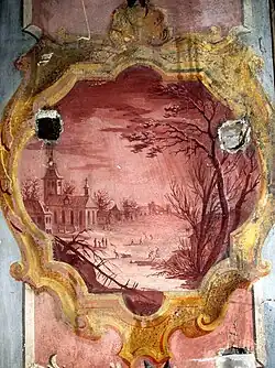 Besonders von Studnitz ließ das Amtshaus reich ausstatten. Bald zierten bemalte Wandvertäfelungen, Stuckdecken und stuckierte Ofennischen das Obergeschoss. Im Oktober 2019 entdeckte man barocke Fresken hinter der Wandvertäfelung.[4] Diese stammen wahrscheinlich aus der Zeit unmittelbar nach dem Bezug des Hauses ab 1739. Vermutlich gehörten sie sogar zu den „erbetenen“ Wandbespannungen aus dem Schloss Friedenstein. Die Fresken wurden diesen Tapeten aller Wahrscheinlichkeit nach in Stil und Darstellungen angepasst. Die drei Fensterleibungen und die dazugehörigen vier Wandpfeiler, auf denen sich die Wandfresken befinden, gehörten zu einem Raum, dessen heute nicht mehr existente Ostwand die Wohnungen von Studnitz und Frankenberg trennte. Die Darstellungen der Fresken entsprechen dem Bandelwerk des Hochbarock und besitzen noch keine Anklänge zum Rokoko. Aufgrund des guten Erhaltungszustands, ist davon auszugehen, dass die Fresken nur kurze Zeit zu sehen waren und dann hinter der hölzernen Wandverkleidung verschwanden. Denn schon 1741 lässt von Studnitz einen Großteil seiner Wohnräume mit einer Wandverkleidung versehen.