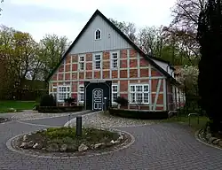 Das eingeschossige giebelständige große Wohn- und Wirtschaftsgebäude als Vierständer-Hallenhaus in Fachwerk mit Steinausfachungen, ziegelgedecktem Satteldach, regionaltypischer senkrechter Verbretterung in den oberen Giebeldreiecken und der Grooten Door mit Korbbogen und barockisierender Tür wurde 1816 (Inschrift) als sogenanntes Vorwerk gebaut. Von 1841 bis 1882 war hier im Eigentum des Königreichs Hannover der Amtssitz des Vogtes. Als nachträgliche Veränderungen wurden das große Dachhaus im Wohnteil in der östlichen Dachfläche, das kleinere Dachhaus in der westlichen sowie ein eingeschossiger Anbau nach Süden hinzugefügt.[1]